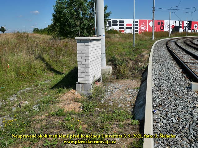 3. 9. 2021 Tady ještě pár snímků z tramvajové trati, jejíž okolí je již pěkně upraveno a když se nové trávníky se zazelenaly. Jen těsně před konečnou Univerzita by si terén ještě zasloužil vyrovnat, či alespoň dohrnout zeminu k rozvaděči na snímku.