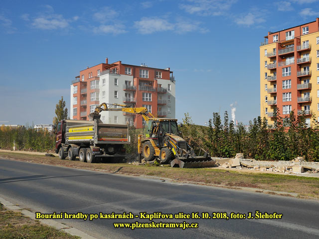 Bourání zdi kasáren 16. 10. 2018 Kaplířova ulice 8. 12. 2018 Koncem října 2018 byla zbourána hradba po pravé straně Kaplířovy ulice (ve směru z Bor) a v prosinci 2018 zde již probíhají nějaké úpravy sítí.