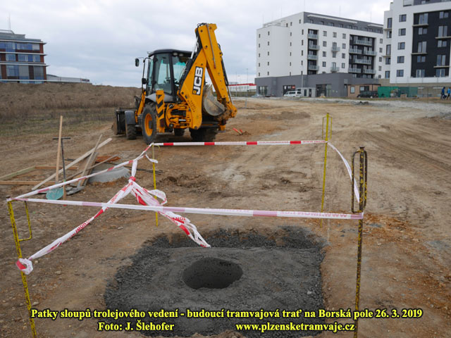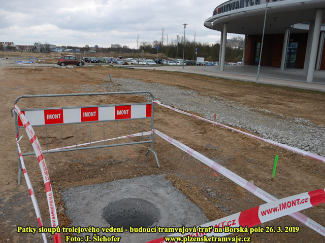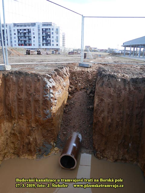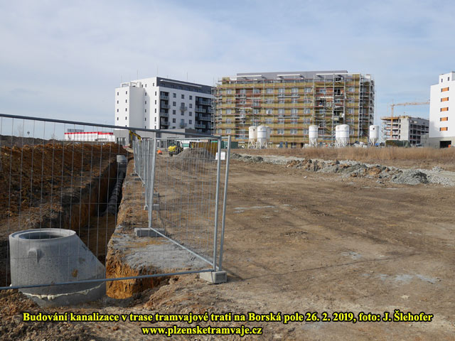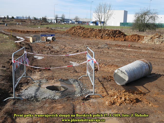 Kanalizace u budoucí tramvajové trati 17. 3. 2019 První patky sloupů trolejového vedení 17. 3. 2019 Zatím co s kanalizací se postupuje od mostu dál, kolem FAVky, tak v zadní části budoucí trati v táhlém oblouku mezi FAVkou a Decathlonem se v polovině března objevují již první patky pro sloupy trolejového vedení. A jak už zaznělo výše, kanalizace je budována také v místě druhého tramvajového obratiště, tedy vedle Decathlonu.