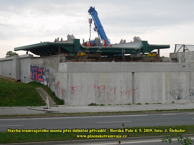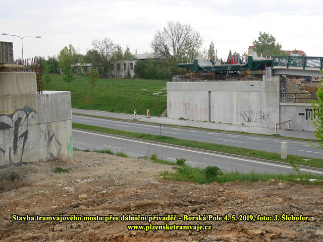 Budoucí tramvajový most přes dálniční přivaděč 4. 5. 2019 Budoucí tramvajový most přes dálniční přivaděč 4. 5. 2019 Most bude sestaven vedle a až po té bude na svém definitivní místo nad dálniční přivaděč nasunut. Hned následující dny začaly práce na jeho montáži. Zde pohled od Borských Polí.