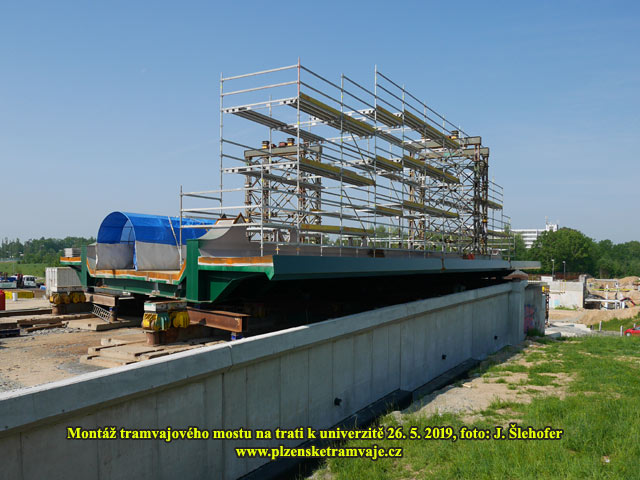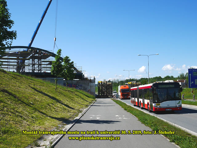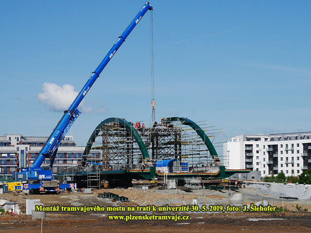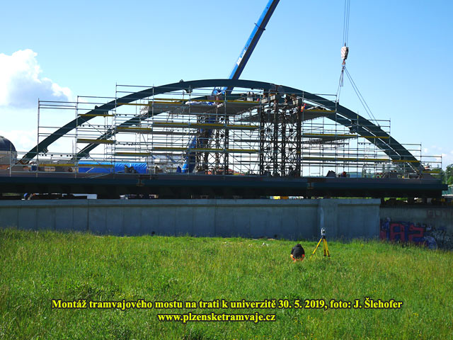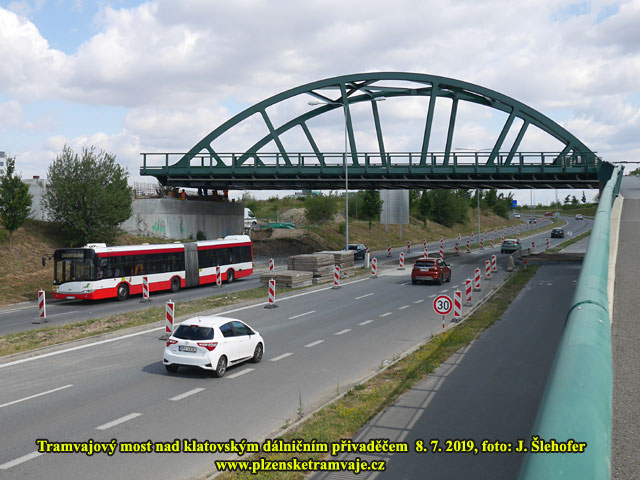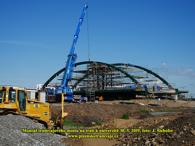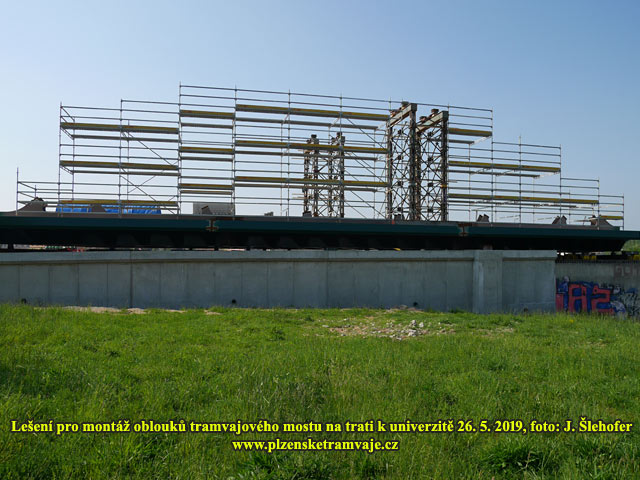 30. 5. 2019 30. 5. 2019 Pokračuje se také na stavbě mostu přes klatovský dálniční přivaděč. Koncem května je již mostovka svařena v celé délce a je stavěno lešení pro montáž oblouků. Ty jsou již na snímcích níže pořízených 30. 5. 2019. Připomínám, že most je montován vedle svého definitivního umístění a teprve později bude nad silnici nasunut.
