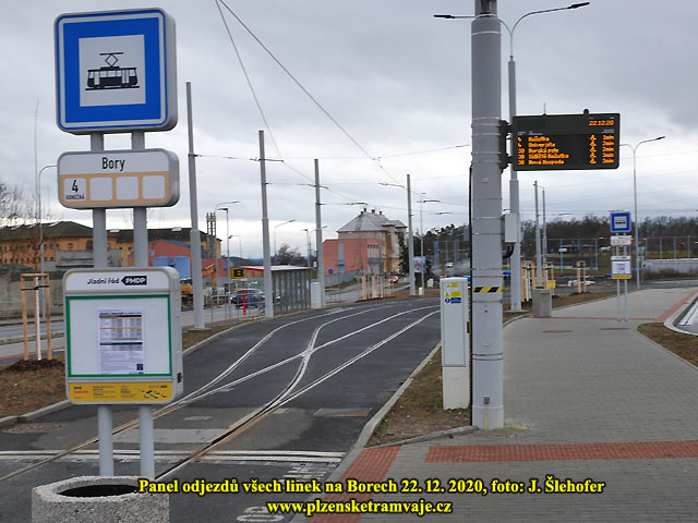 Panel s odjezdy na konečné Bory U výstupní tramvajové zastávky Bory se v půlce listopadu 2020 objevuje větší panel inteligentní zastávky, na kterém se zobrazují všechny tramvajové i autobusové spoje, které z terminálu Bory odjíždějí.