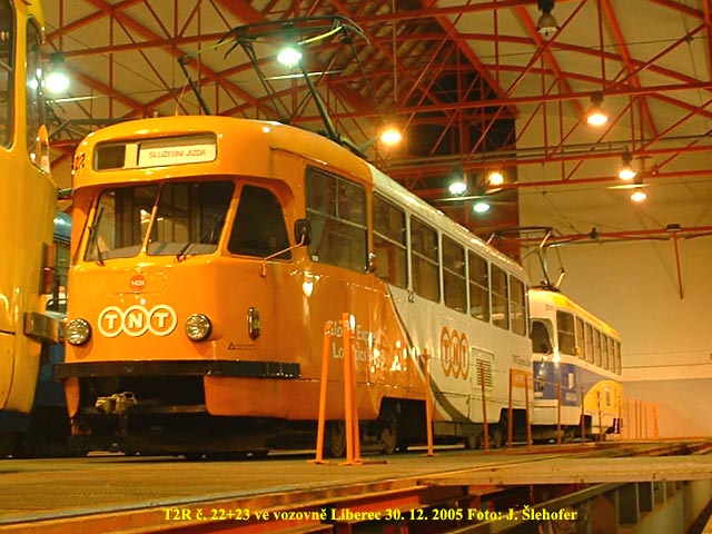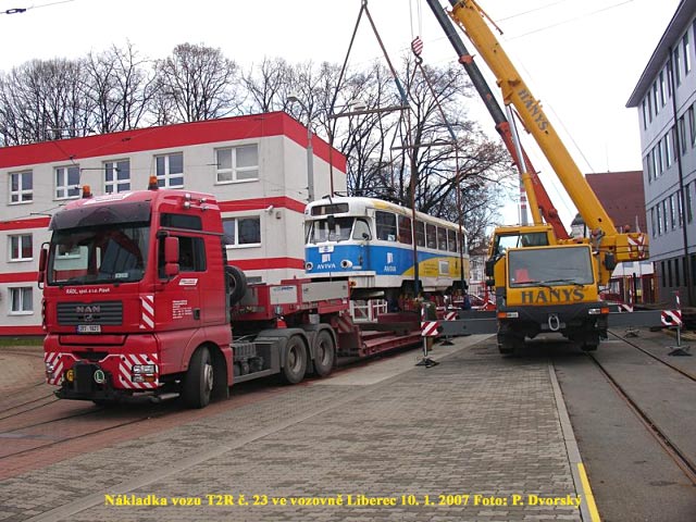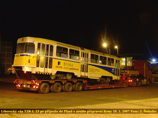 V odpoledních hodinách dne 10. 1. 2007 byla konečně tramvaj T2R č. 23 naložena v liberecké vozovně na trajler a v nočních hodinách dorazila do Plzně. Zbytek noci přečkala v areálu přepravce, odkud pochází fotografie vpravo dole. Do vozovny Slovany byla přivezena v ranních hodinách dne 11. 1. 2007.