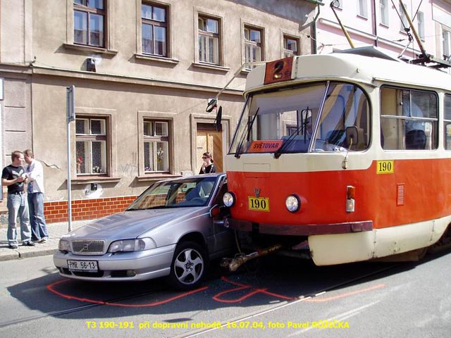 Krátce před odeslání do DP Most na velkou prohlídku, měla ještě drobnou nehodu s automobilem ve Sladkovského ulici.