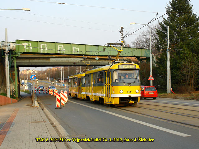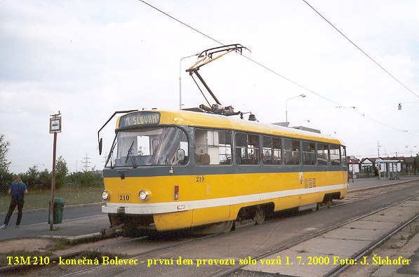 Na fotografii v Bolevci je vůz T3M 210 rovněž v první den provozu sólo vozů. Rozpojeny tehdy byly všechny "žluté modernizace" (209, 210, 229, 230, 237, 238) a k nim ještě i většina fialových