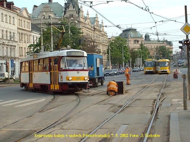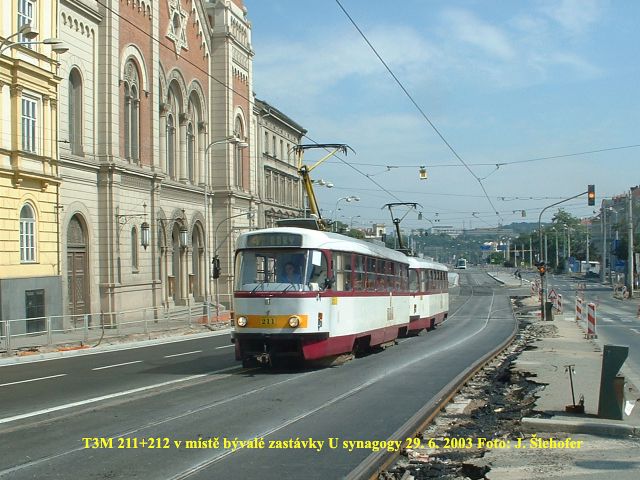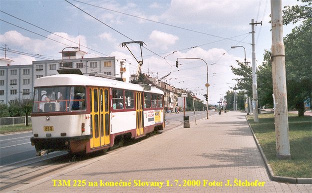před prázdninami, ale i po nich nadále a celotýdně zůstal. Vlevo je T3M 225 na náměstí Milady Horákové, v pravo T3M 221 v Křižíkových sadech.
