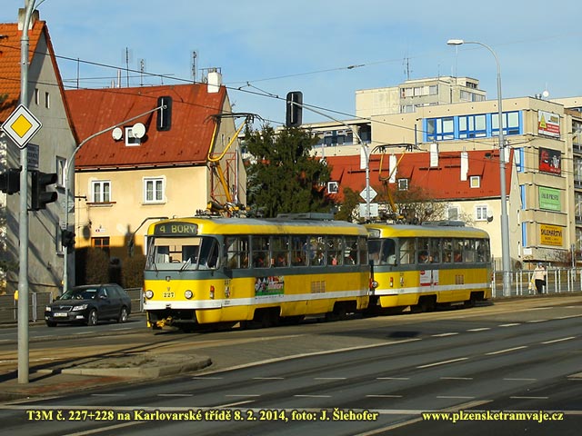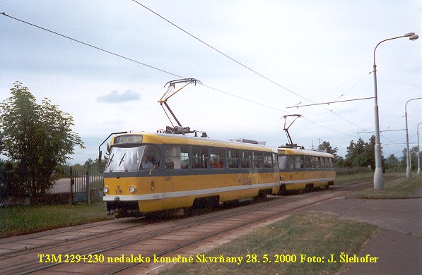 Vlevo je souprava T3M 229+230 zachycena nedaleko konečné ve Skvrňanech. Na tomto krátkém úseku, jsou jako na jediném místě v Plzni, vedeny koleje