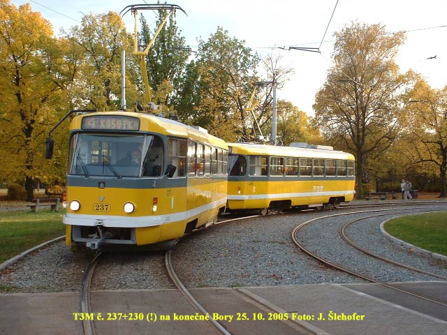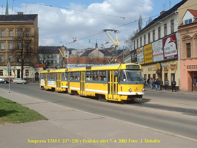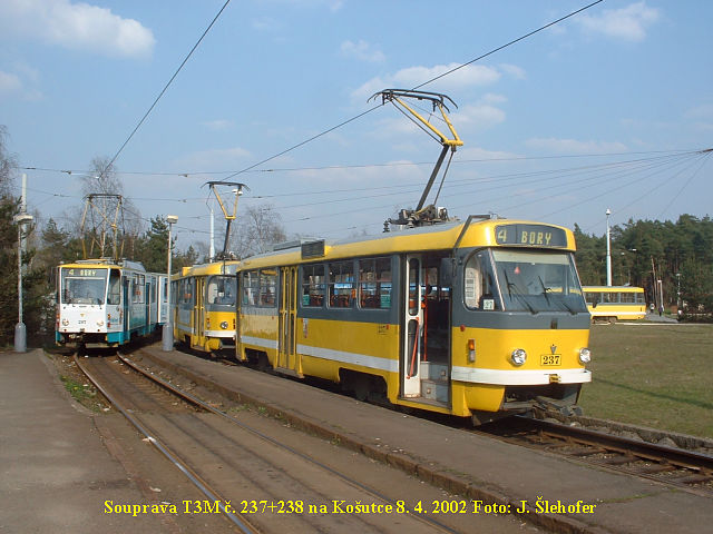 Na fotografii vlevo projíždí souprava ev. č. 209-210 na lince č. 2 kolem Hlavního nádraží. Na fotografii vpravo je právě souprava T3M č. 237+238 na Košutce.