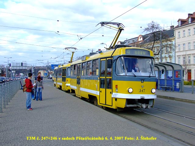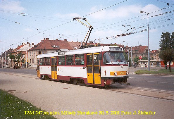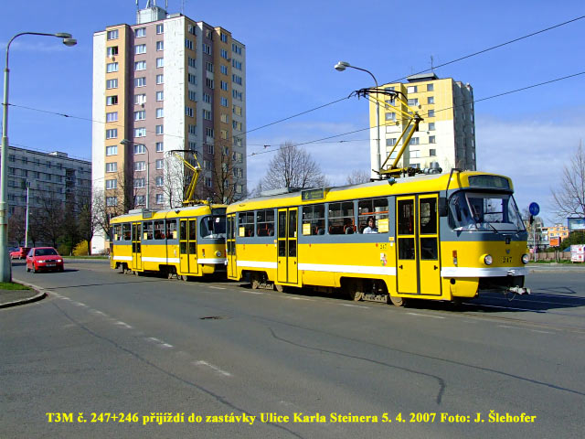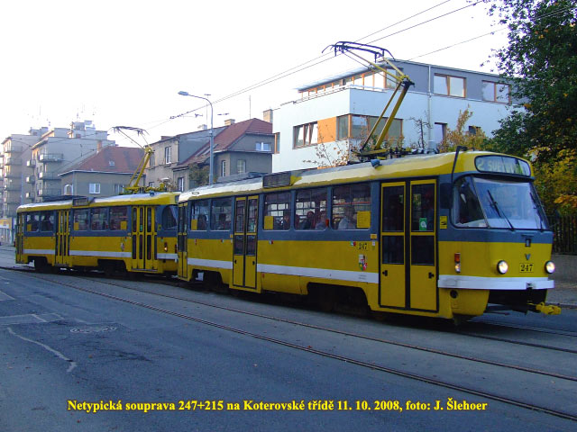 Zde díky zvýšeným nástupištím neotevře výklopné dveře. V době nedostatku souprav se vůz 247 objevil také v nezvyklém spojení 247+215 v provozu na lince č. 2.