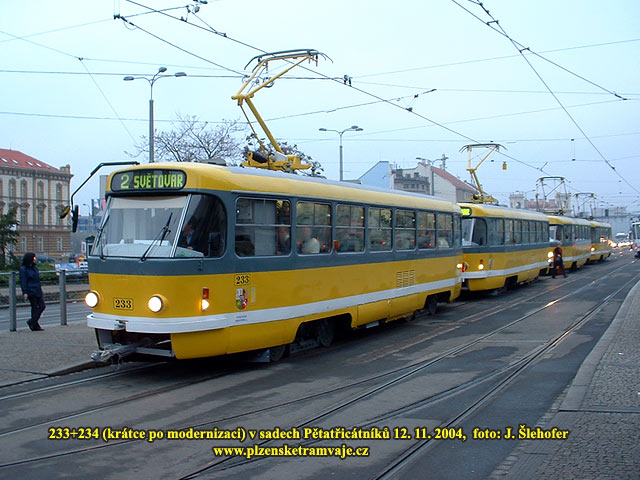 Souprava tramvají č. 233+234 je na delší dobu poslední soupravou modernizovanou v dílnách Plzeňských městských dopravních podniků - v Cukrovarské