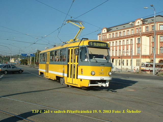 šejdr linky č. 1. Další vůz s číslem 261 tentokráte zatím sólo (vpravo), vyjel 17. 9. 2003.