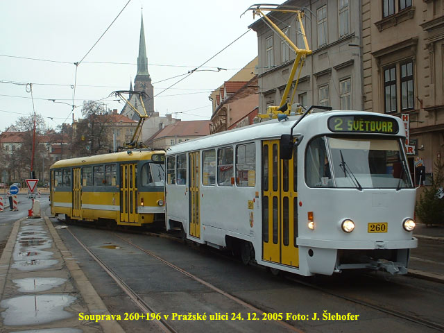 sól na lince č. 1 v pátek 23. 12. 2005. Vůz 260 v bílém nátěru vyjel na Štědrý den na linku č. 2 v nezvyklé