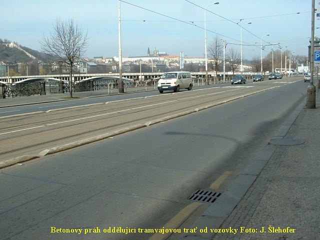 Souprava 332+265 v Bolevci Výhodou tramvajových tratí ve středovém pásu, či přímo na samostatném tělese je hlavně to, že v případě dopravních kongescí (hezky česky v případě zácpy), mohou tramvaje běžně Tramvajová trať oddělená betonovým prahem. projíždět a nezdržují je automobily stojící v kolonách. Ty se místy např. i na Klatovské třídě derou až na koleje. Tam by se tomu však dalo zabránit umístěním malých betonových prvků, které by zamezily vjezdu aut do kolejiště, ale v případě nouze umožňují přejetí a následnou jízdu po tramvajových kolejích např. pro potřeby sanitek či hasičů. Tyto prvky se již kromě ciziny objevují v hojném počtu i v Praze.