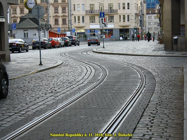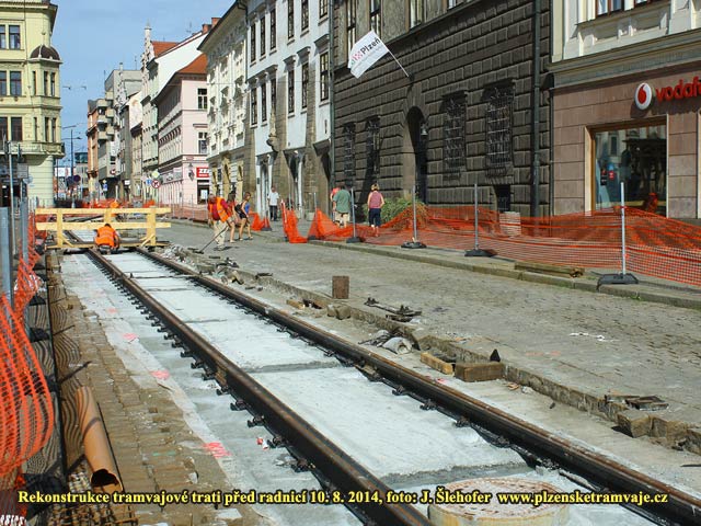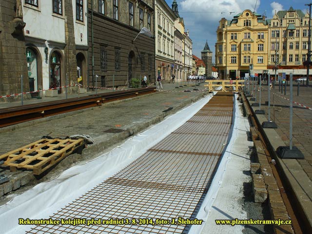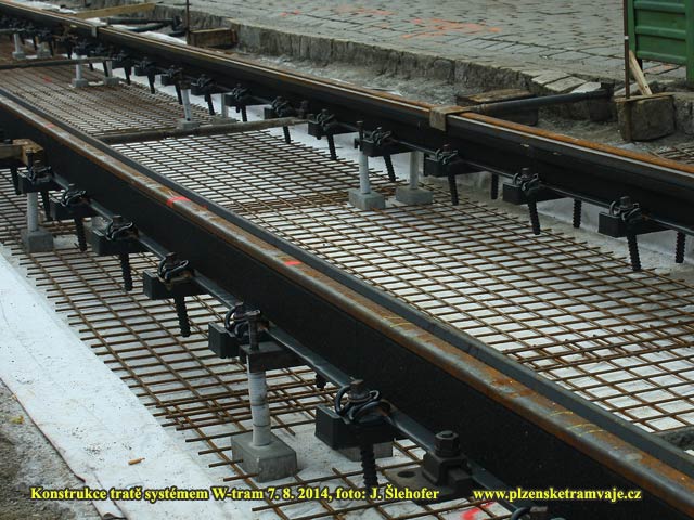 Rekonstrukce kolejiště před radnicí - konstrukce kolejiště systémem W-tram 7. 8. 2014 Rekonstrukce kolejiště před radnicí - kolejiště před radnicí již zalité betonem 10. 8. 2014 Na kolejnice jsou samozřejmě nalepené pryžové protihlukové bokovnice. Celá konstrukce s kolejištěm bude zalita betonem a povrch může být následně zadlážděn (náměstí Republiky) nebo zasafaltován (Skvrňany). Pevná jízdní dráha s upevěnním W-tram se na krátkých úsecích společně se Rhedou použila poprvé na v obloucích ve Skvrňanech (2012), následně v Pražské ulici a na náměstí Republiky (2014). Na dlouhém úseku je tato technologie použita v ulici Terezie Brzkové ve Skvrňanech v létě 2015.