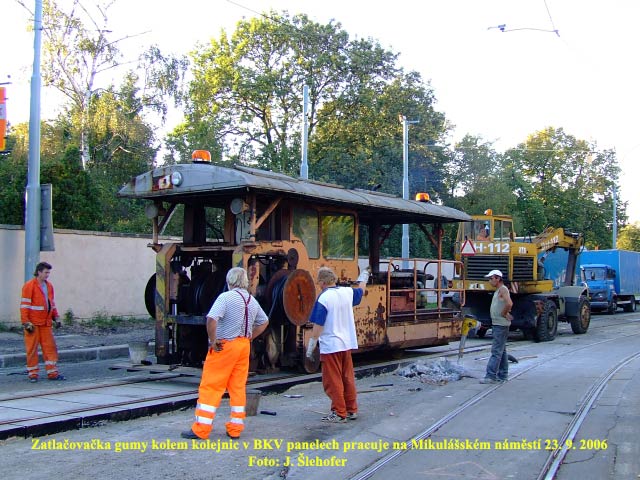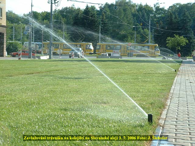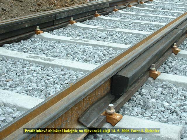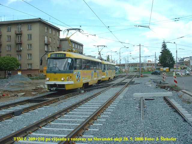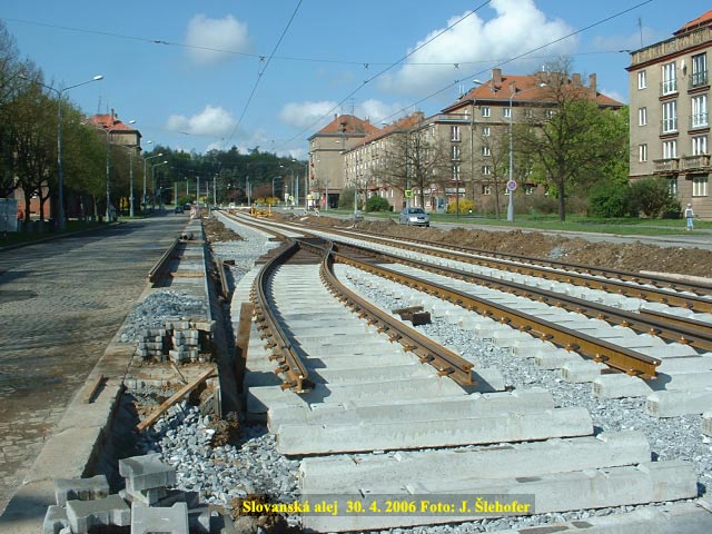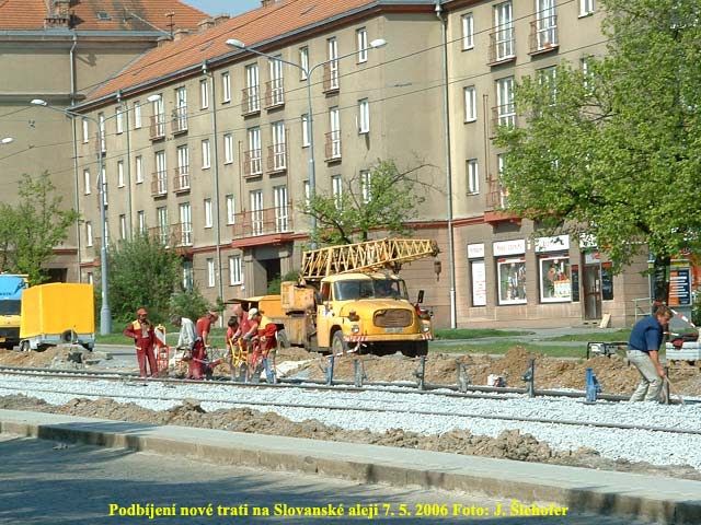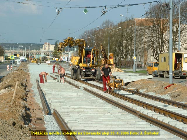 Kolejiště na Slovasnké aleji 30. 4. 2006 Podbíjení nové trati na Slovanské aleji 7. 5. 2006 Protihlukové obložení kolejnic na Slovanské aleji 14. 5. 2006 T3M č. 209+210 projíždí po otevřeném kolejišti ještě před protihlukovým obložením kolejnic a zatravněním kolejiště na Slovanské aleji 28. 5. 2006