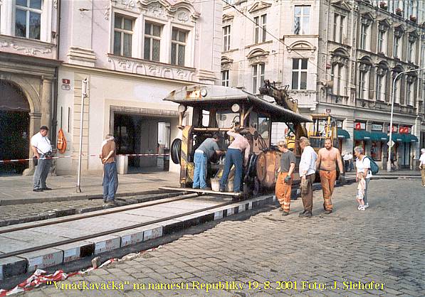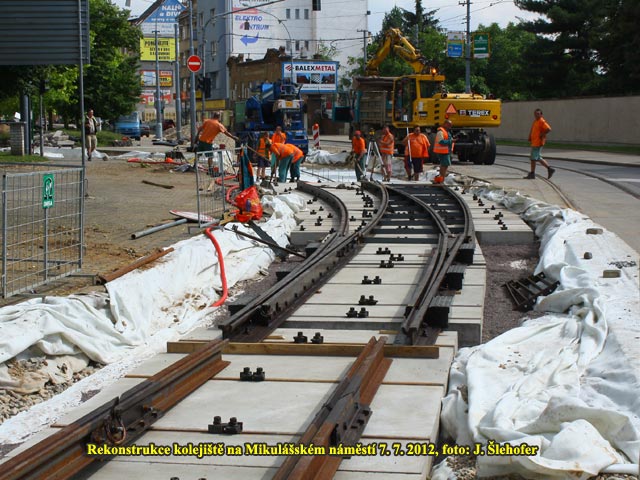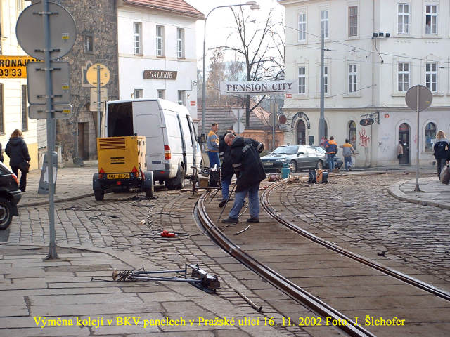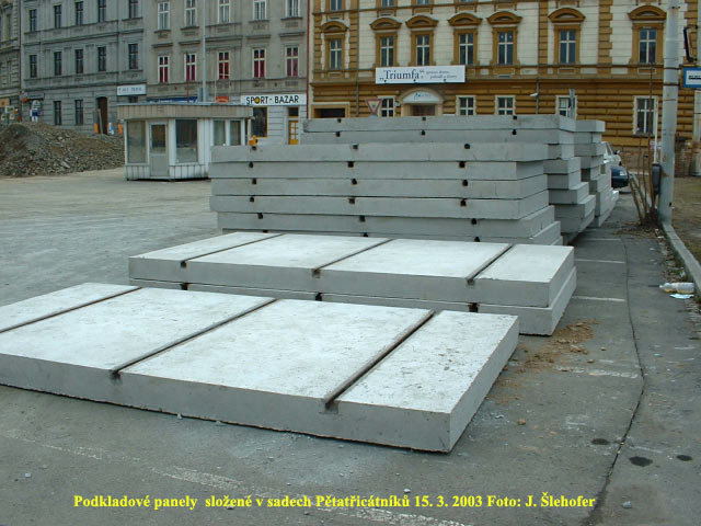 Složené podkladové panely čekají na své použití při rekonstrukci v sadech Pětatřicátníků - 15. 3. 2003 Kolejnice budou přišroubovány na VÚIS panely - sady Pětatřicátníků 13. 5. 2003 Pokládka VÚIS panelů - sady Pětatřicátníků 28. 4. 2003 Rostoucí koleještě v sadech Pětatřicátníků 19. 4. 2003