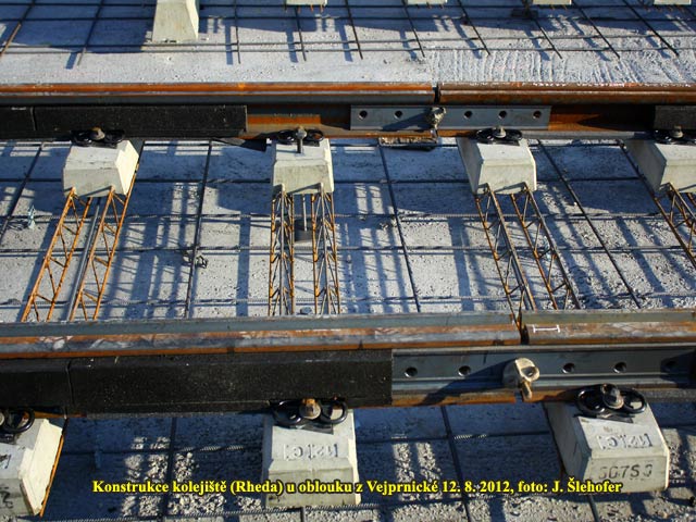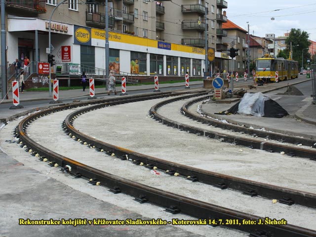 Rekonstrukce oblouku Sladkosvkého - Koterovská v létě 2011 Rekonstrukce oblouku Sladkosvkého - Koterovská v létě 2011 V roce 2011 je v oblouku na křižovatce ulic Sladkovského a Koterovská použita konstrukce pevné jízdní dráhy Rheda City. Kolejnice jsou připevněny na kolejový rošt. Po té co, jsou směrově i výškově správně usazené a obložené protihlukovými bočnicemi, je celé kolejiště zalité betonem. Vršek kolejiště je zakryt ještě postupně asfaltovými vrstvami.