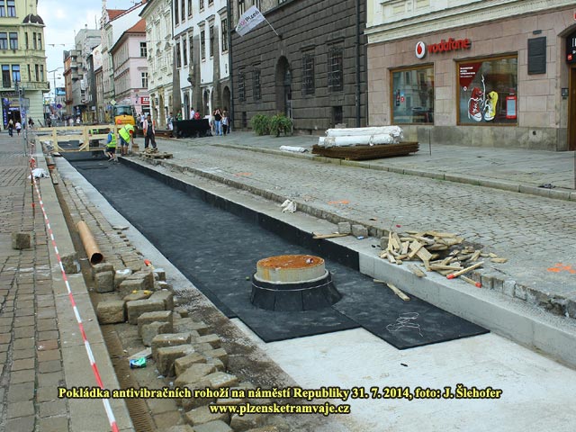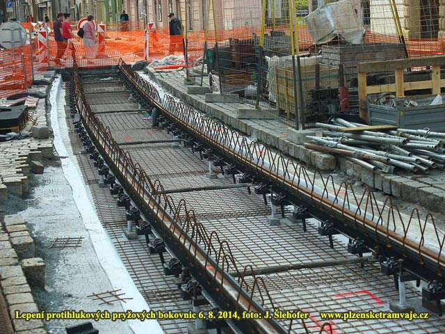 Rekonstrukce kolejiště před radnicí  - pokládka protivibračních rohoží 31. 7. 2014 Rekonstrukce kolejiště před radnicí 3. 8. 2014 Rekonstrukce kolejiště před radnicí - lepení protihlukových bokovnic 6. 8. 2014 Po vytěžení spodních vrstev je vybetonována podkladová vrstva včetně bočnic. Na betonovou desku mohou být pokládány antivibrační rohože (použité byly v Pražské ulici, či na náměstí Republiky, nikoliv však ve Skvrňanech) a teprve na nich roste vlastní konstrukce kolejiště s upevněním W-tram. Kolejnice jsou usazeny do výsledné polohy pomocí různých podkladů a svěrek. Na kolejnice jsou nasazeny plastové podkladnice s plastovými hmoždinkami.
