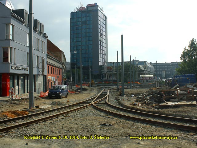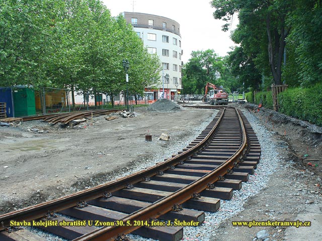 Rekonstrukce obratiště U Zvonu - 30. 5. 2014 Rekonstrukce obratiště U Zvonu - 5. 10. 2014 Kolejnice na pražcích a to dokonce opět na dřevěných, byly také použity při rekonstrukci obratiště u zvonu v roce 2014. Trať je zde zakryta dlažbou a to jak dlažebními kostkami, tak místy také kamenými deskami.