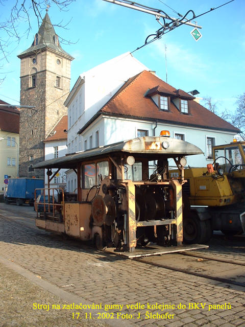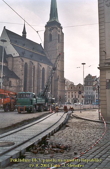 Zatlačovačka na náměstí Republiky 19. 8. 2001 Pokládání BKV panelů na náměstí Republiky 19. 8. 2001 Tento způsob konstrukce tramvajové trati má však i své nevýhody. Mezi ně patří i to, že panely nejsou dostatečně upevněné a zejména v obloucích může docházet k jejich postupnému posunu, vlivem odstředivé síly tramvají v obloucích. Patrné toto bylo například v zatáčce z Vejprnické ulice k zastávce Karla Steinera ve Skvrňanech (ještě před rekonstrukcí oblouku), kde již byl asfalt vně oblouku vedle kolejí natolik vyboulen, že musel být vybroušen, aby zde Výměna kolejnic v oblouku v Pražské ulici 16. 11. 2002 Zatlačovačka na Mikulášském náměstí 23. 9. 2006 tramvaje nedrhly. Na vnitřní straně oblouku pak naopak vzniká mezera, jak se celá zatáčka posunuje. Velikou nevýhodou této technologie tramvajové trati je také to, že se trať nedá příliš udržovat. Lze do jisté míry opravovat povrch panelů a vlastní kolejnice navařovat (vyvařovat oblouky).