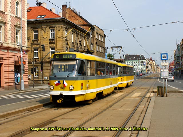 Rekonstrukce trati do Skvrňan (Škoda III. brána) 4. 8. 1999 Souprava T3G č. 239+240 na Chodksém náměstí 1. 5. 2009 Během dalších rekonstrukcí tratí od konce osmdesátých let byl tento způsob použit i v centru města v okolí náměstí Republiky, od nádraží ČD (od Železniční ulice) na Mikulášské náměstí, postupně celá trať na Světovar i do Skvrňan (až od křižovatky u III. brány Škodovky), celá trať na Bory od bývalé stanice U Synagogy a také úsek ve směru na Severní přeměstí a to mezi Hlavní poštou a zastávkou U Družby.