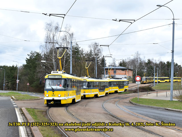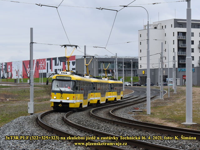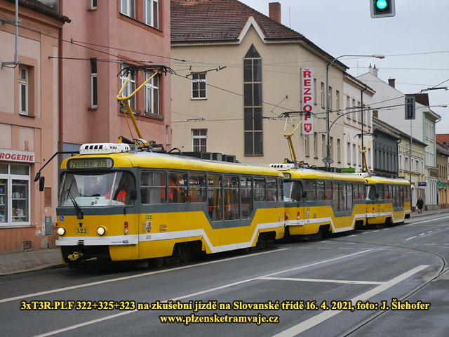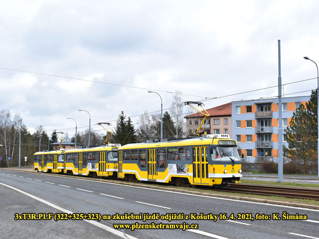 A myšlenky na provozování trojic vozů "T" v Plzni také nejsou mrtvé. V pátek 16. 4. 2021 se na zkušební jízdě objevuje souprava 3 x T3R.PLF (č. 322+325+323). Souprava kromě pracovníků PMDP vezla také pracovníky SVS a účelem tak bylo také posouzení délky zastávek, respektive zjištění rozsahu jejich případných nutných úprav. Trojice T3R.PLF tak byla ještě o pár metrů delší, než před lety testovaná T3R.PLF + T3R.P + T3R.P a jde tak o nejdelší možnou kombinaci, která by se v provozu mohla objevit. Za pravděpodobnější však považuji případné nasazení vozů 3xVario se stejnou délkou a upraveným kamerovým systémem.