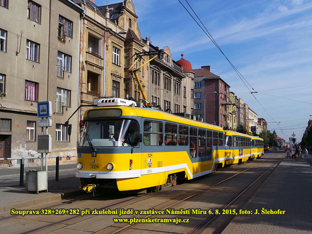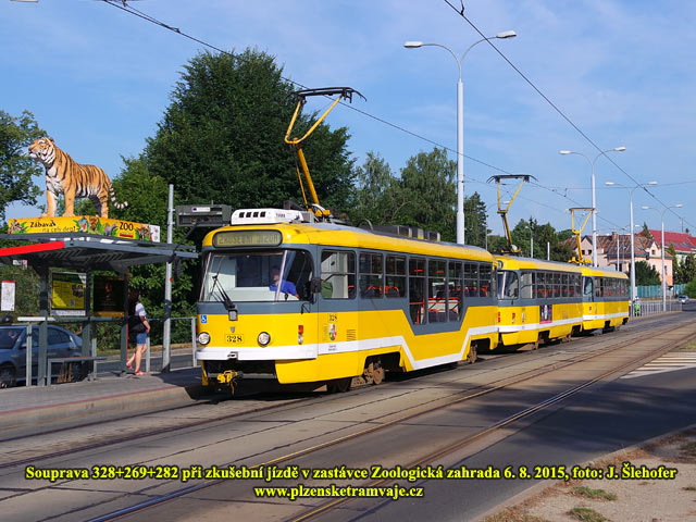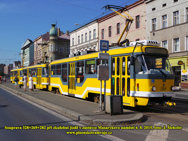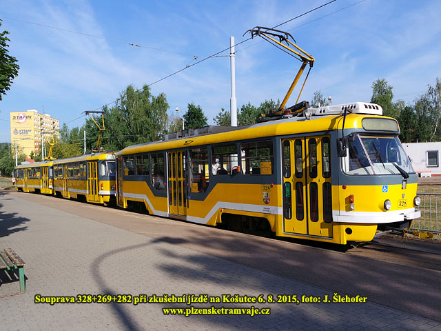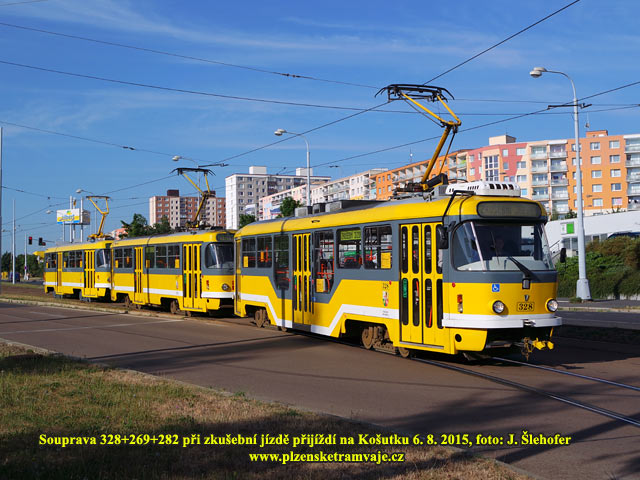 Zkušební jízda soupravy 328+269+282 na Košutce 6. 8. 2015 Soupravy 328+269+282 přijíždí při zkušební jízdě na Košutku 6. 8. 2015 Krátce na to, pak 6. 8. 2015 dokonce trojice vozů ve složení 328 + 269 + 282 tedy T3R.PLF + T3R.P + T3R.P vyjela na zkušební jízdu na Košutku a na Bory. Zda se skutečně tří vozové soupravy v pravidelném provozu v Plzni objeví, je zatím však nejisté.