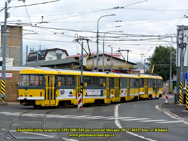 Zkušební jízda soupravy 329+208+245 po vozovně Slovany 28. 7. 2015 První reálná stopa o tom, že se o provozování trojic v Plzni opravdu uvažuje, se objevila dne 28. 7. 2015, kdy po areálu vozovny koužila souprava 329+208+245.