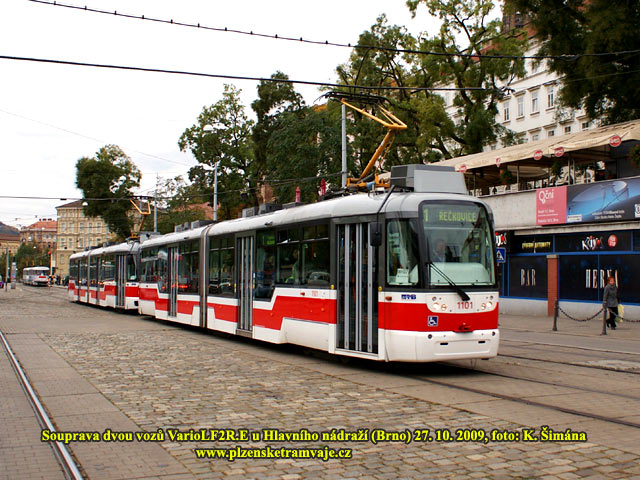 Souprava dvou vozů VarioLF2R.E u Hlavního nádraží v Brně 27. 10. 2009, foto: K. Šimána Na popud brněnského dopravního podniku tak byla v roce 2009 ve spolupráci se Sdružením dopravních podniků iniciována legislativní změna. Maximální délka tramvajové soupravy tak nyní může být až 65 metrů a tedy ani provozování trojic tak dnes nic nebrání.