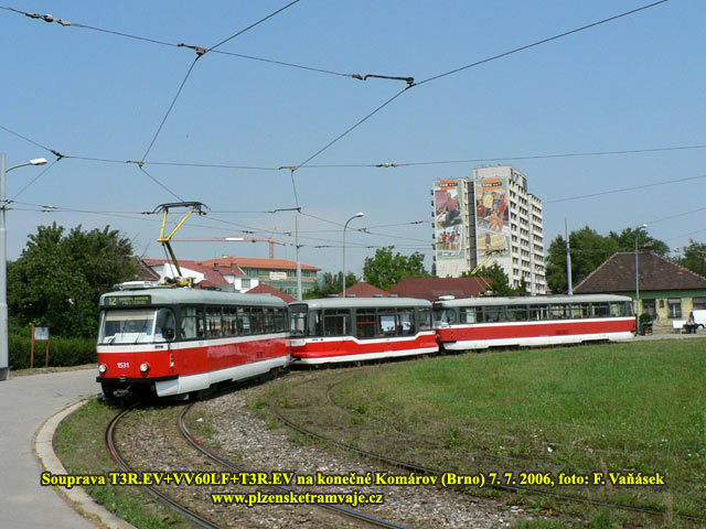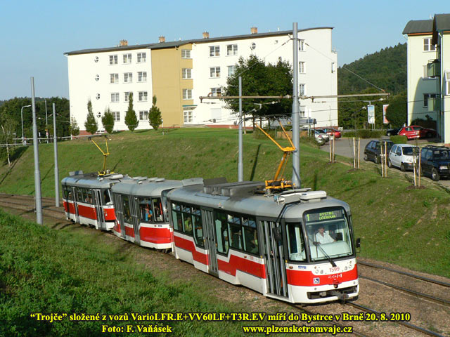 Souprava T3R.EV+VV60LF+T3R.EV na konečné Komárov (Brno) 7. 7. 2006, foto: F. Vaňásek “Trojče” složené z vozů VarioLF+VV60LF+T3R.EV míří do Bystrce v Brně 20. 8. 2010, foto: F. Vaňásek Naopak na brněnské lince č. 1 bylo potřeba zvýšit její kapacitu a legislativně zjednodušit provoz dlouhých souprav (VarioLFR.E+VV60LF+T3R.EV, či 2x VarioLF2R.E, později VarioLF2R.E + VarioLFR.E).