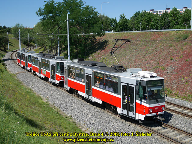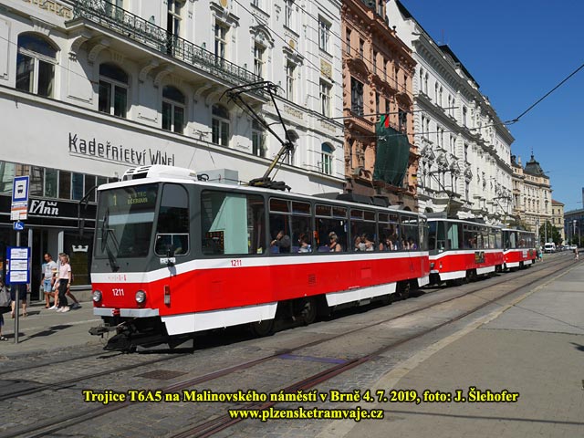 Trojice T6A5 v Brně 3. 7. 2020 O letních prázdninách 2019 vyjíždí v Brně na lince č. 1 do zkušebního provozu s cestujícími trojice vozů T6A5. Zkušební provoz byl relativně úspěšný a tak od podzimu jsou nasazovány trojice vozů T6A5 i na dvě pořadí linky č. 1. Podobné trojice jsou nasazovány také příležitostně v Ostravě např. jako posily při konání hudebních festivalů.