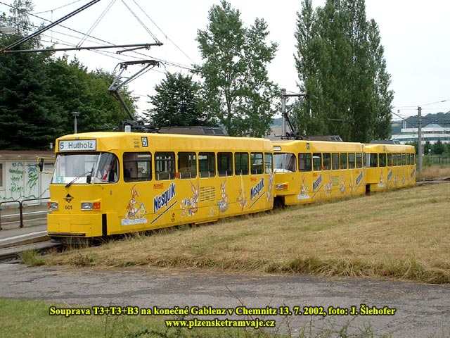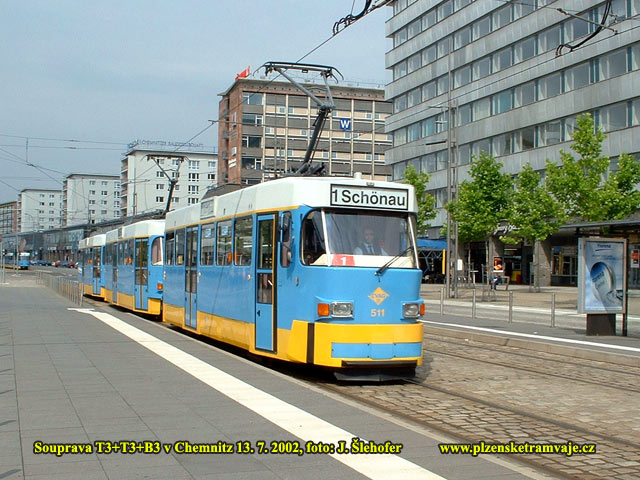 Chemnitz 13. 7. 2002 Chemnitz 13. 7. 2002 Asi nejblíže k Plzni byly třívozové soupravy T3+T3+B3 provozovány v německém měste Chemnitz (dříve Karl Marx Stadt). Přepravní potřeba na zdejších linkách však zřejmě mírně klesla a tak kromě nízkopodlažních vozů jsou zde provozovány již pouze dvojice modernizovaných vozů T3.