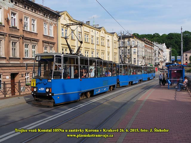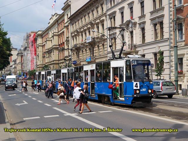 Trojice vozů Konstal 105Na - Krakow 26. 6. 2015 Trojice vozů Konstal 105Na - Krakow 26. 6. 2015 Nejen české vozy se objevují v trojicích. Podobné vozy Konstal (celé označení Konstal 105Na) jsou v trojicích provozovány v polském Krakově. I zde však poslední dobou začínají být nahrazovány nízkopodlažními vozy o délce 43 metrů.