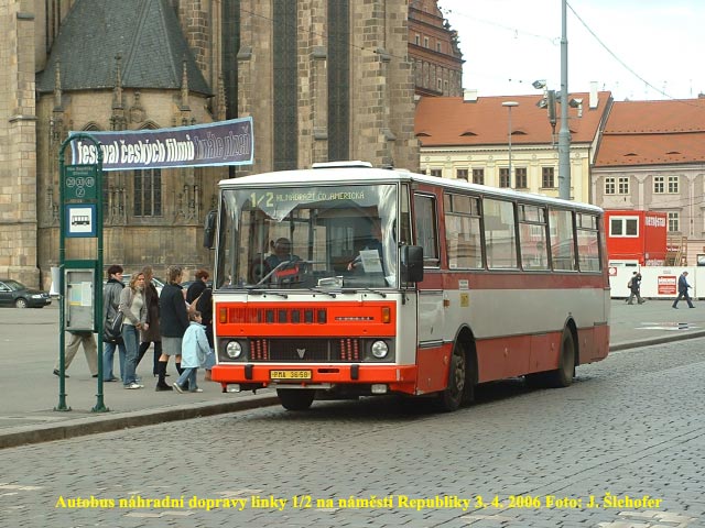přestupují na autobusy náhradní dopravy označené linkou 1/2. Ze zastávky Náměstí Republiky, Dřevěná pendlují autobusy do zastávky