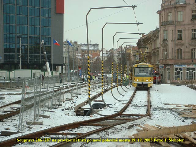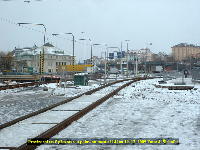 po celou dobu rekonstrukce poloviny mostu. Na provizorní trati jdoucí po mostě, jsou koleje upevněny na pražcích, avšak před mostem na straně k centru,