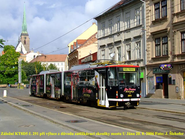 V zastávce Anglické nábřeží, Pražská stál záložní vůz KT8D5 č. 291. Na mostě probíhala měření bez a se zatěžkáním