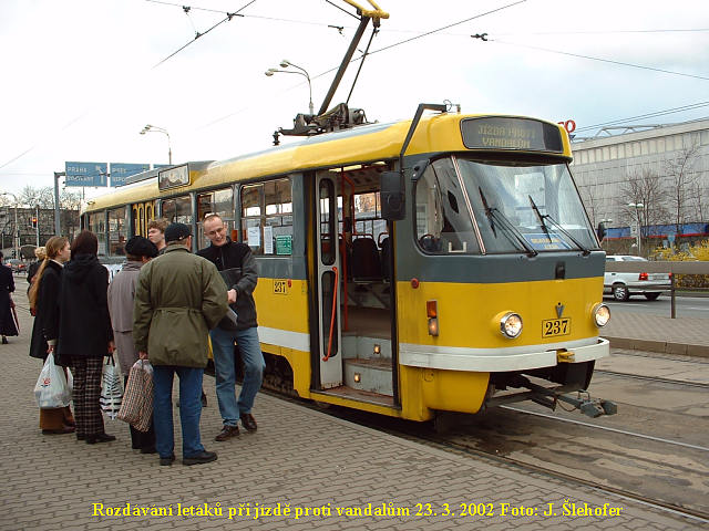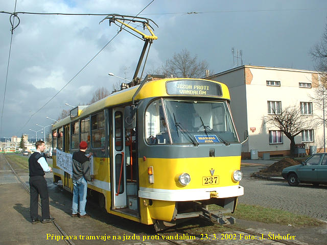 s vystrojováním objednané tramvaje (T3M č. 237) přistavené na Slovanské Aleji. Na levý bok byl připevněn