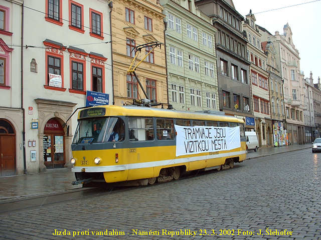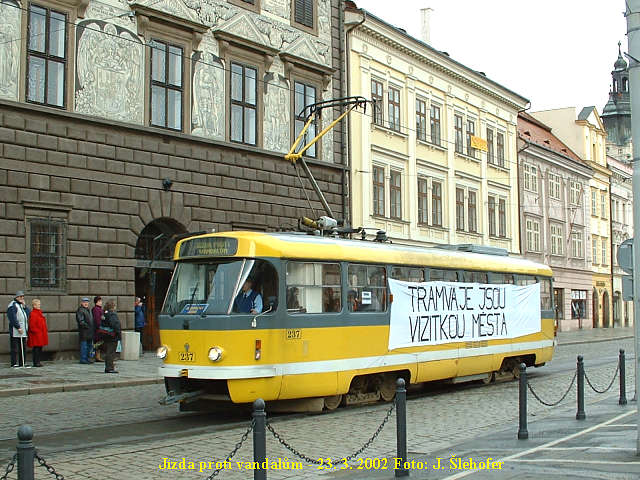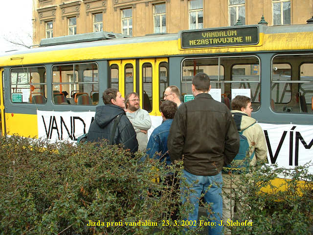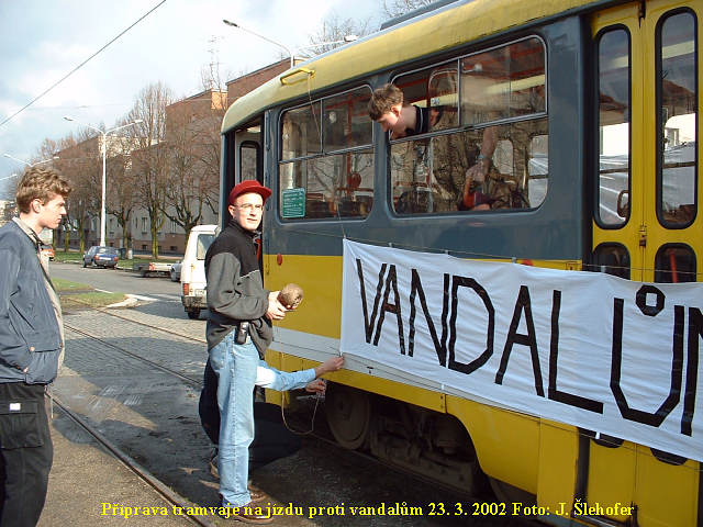 transparent s nápisem "Tramvaje jsou vizitkou města" a na pravý "Vandalům nestavíme!" Transparenty doplnilo