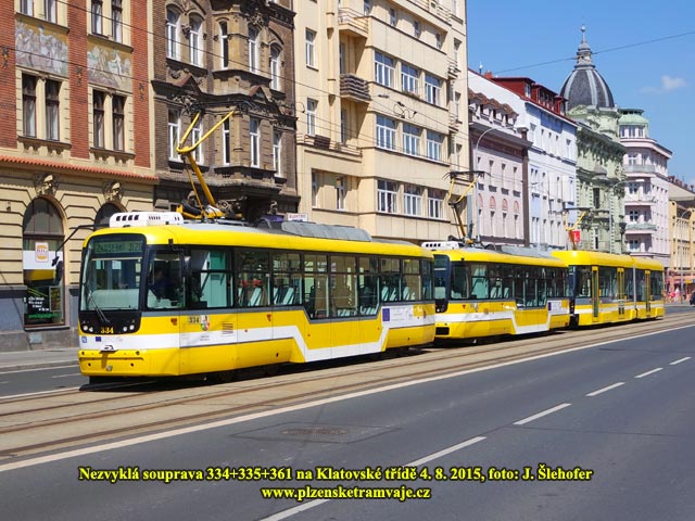 Zkušební jízda nezvyklé soupravy na Klatovské třídě 334+335+361 - 4. 8. 2015 V létě 2015 se začíná pracovat na úpravách vozu Vario LF 2/2 IN č. 363 pro možnost spojování v soupravě s vozem Vario LF plus. Toto spojování bylo požadováno v zadání vozu Vario LF 2/2 IN a v budoucnu by všechny vozy Vario LF 2/2 IN měly být upraveny pro spřahování s vozy Vario LF plus. Zajímavý vláček, kdy souprava 334+335 táhla Inku č. 361, bylo možné spatřit 4. 8. 2015 cestou na Bory. Účelem bylo další měření vybočení spřáhel u vozu Vario LF2/2 IN pro nutné úpravy krytů spřáhel. Esíčko z vnitřní koleje na výjezdu z obratiště Bory je považováno za nejnáročnější místo v síti.