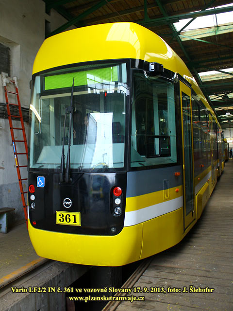 Prototyp tramvaje Vario LF2/2 IN krátce po složení ve vozovně Slovany 17. 9. 2013 Prototyp tramvaje Vario LF2/2 IN plus krátce po složení ve vozovně Slovany 17. 9. 2013 První dvoučlánkové obousměrné Vario bylo do Plzně dodáno 17. 9. 2013. Celé označení je Vario LF2/2 IN.