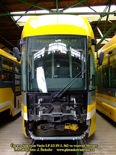 Vario LF 2/2 IN č. 362 při úpravách čela ve vozobně Slovany 1. 5. 2016 Vario LF 2/2 IN č. 361 přijíždí do zastávky Mozartova 5. 5. 2016 Zatím, co vůz 363 najíždí zkušební kilometry v soupravě, tak u ostatních vozů Vario LF 2/2 IN probíhají shodné úpravy. Upravují se čela výměnou krytů spřáhel, doplňují se zásuvky mnohočleného řízení a vozy dostanou upravený software umožňující ovládání i případných souprav s vozem Vari LF plus. Po úpravách pak vyjíždí 4. 5. 2016 vůz č. 361, jehož čelo bylo současně opravováno po nehodě.
