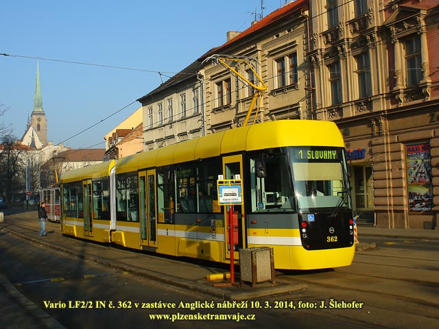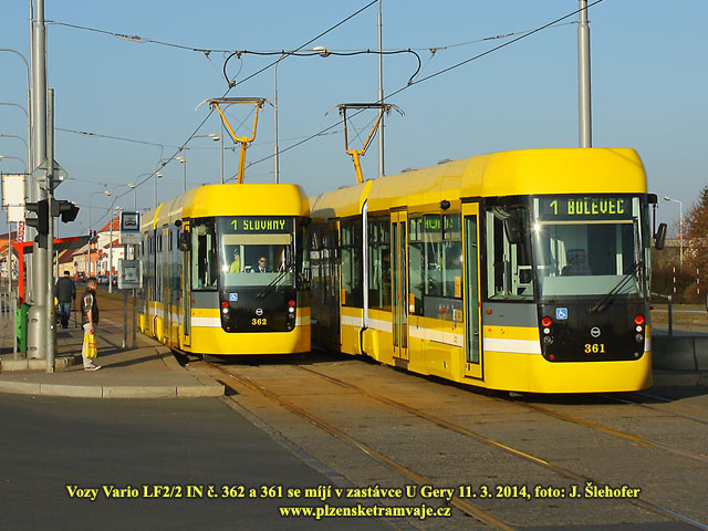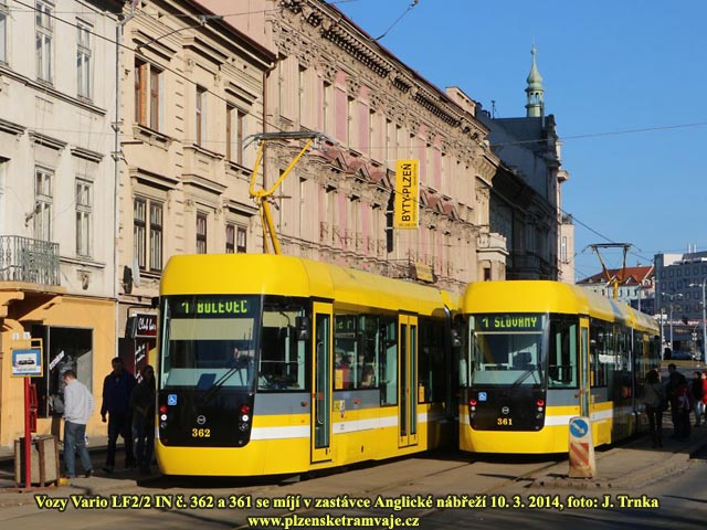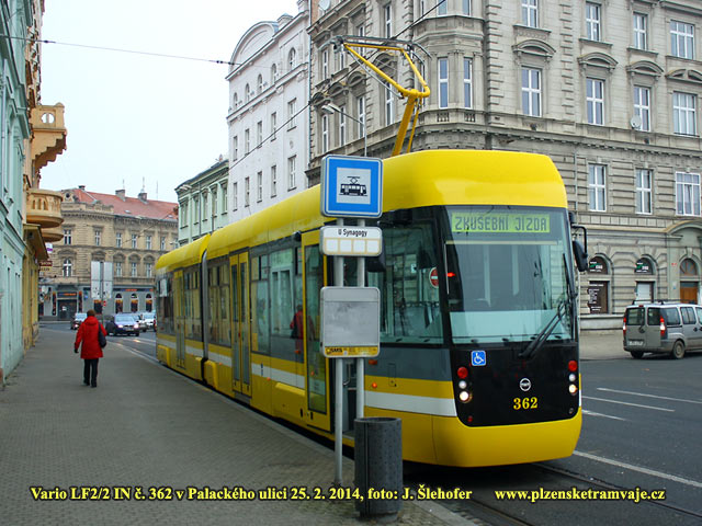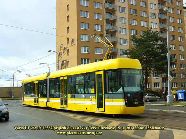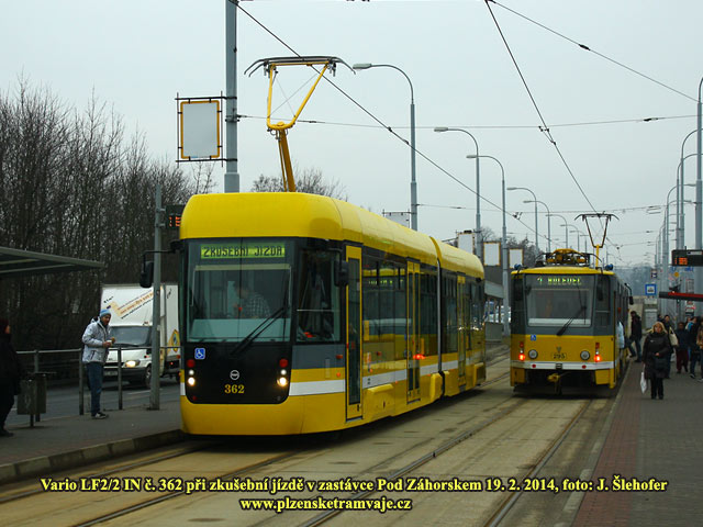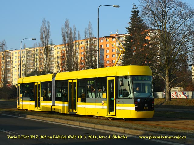 Vario LF2/2 IN č. 362 na zkušební jízdě v zastávce Pod Záhorskem 19. 2. 2014 Vario LF2/2 IN č. 362 na zkušební jízdě v sadech Pětatřicátníků 19. 2. 2014 Druhý vůz byl dodán 7. 12. 2013. V prvním čtvrtletí roku 2014 se očekává dodání dalších dvou. Tím bude tato zakázka patrně ukončena. Již jsem zazanamenal několik ohlasů, že by se lidem líbil tento vůz v tříčlánkovém provedení. Dle různých možná spekulačních teoriích z internetových diskuzí, Vario LF2/2 IN č. 362 na zkušební jízdě v zastávce Pod Záhorskem 25. 2. 2014 je však tramvajový trh v ČR již rozdělen tak, že dlouhé tramvaje dodává pouze Škoda a krátké Pragoimex. Odpovídá tomu i účast těchto firem ve výběrových řízeních na vozy dané délky. Případná dodávka tříčlánkových vozů podle tohoto rozdělení trhu není tak reálná.