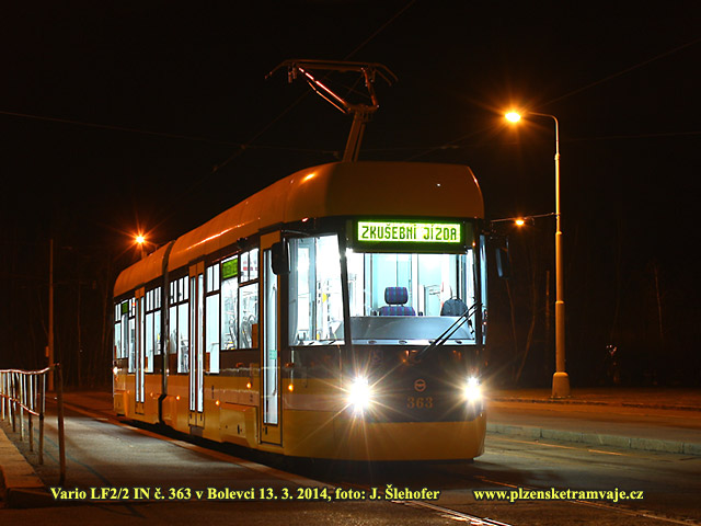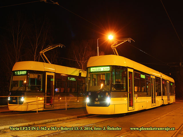 Varioo LF2/2 IN č. 363 při zkušební jízdě v Bolevci 13. 3. 2014 Varia LF2/2 IN č. 362 a 363 v Bolevci 13. 3. 2014 Varioo LF2/2 IN č. 362 v zastávce Macháčkova 15. 3. 2014 Varioo LF2/2 IN č. 362 přijíždí do zastávky Terezie Brzkové 15. 3. 2014