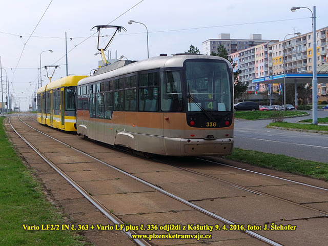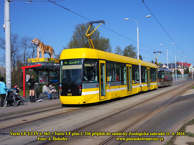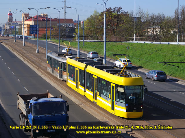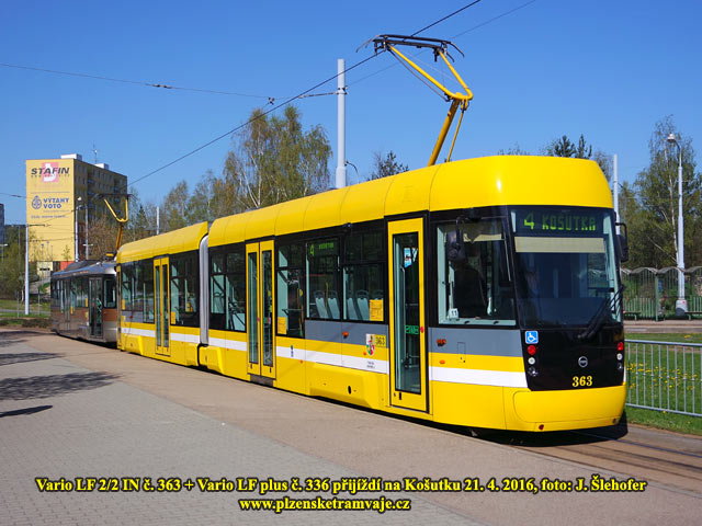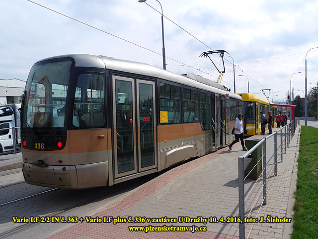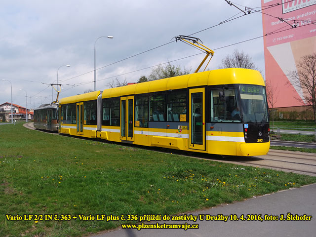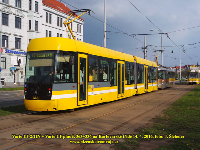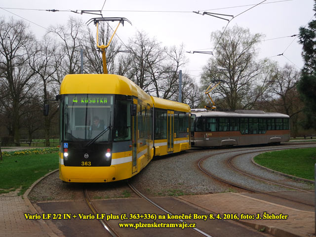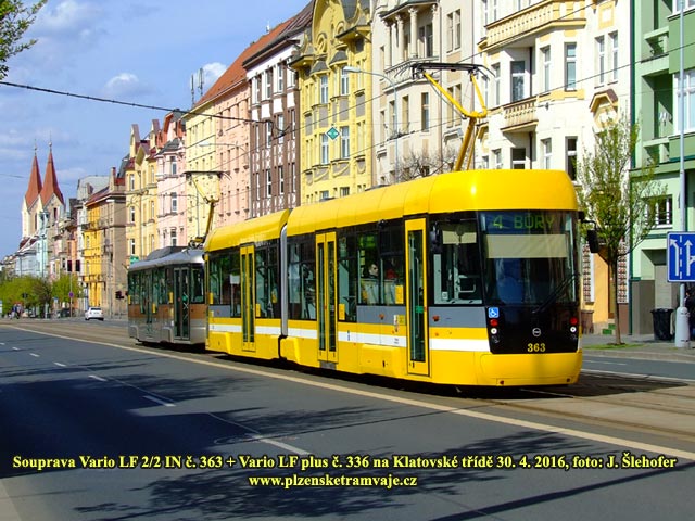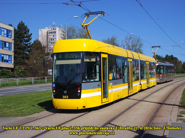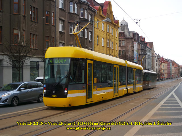 Vario LF 2/2 IN + Vario LF plus (č. 363+336) na Borech 8. 4. 2016 Vario LF 2/2 IN + Vario LF plus (č. 363+336) na Klatovské třídě 8. 4. 2016 V pátek 8. 4. 2016 vyjíždí nesourodá souprava 363+336 konečně do zkušebního provozu s cestujícími a samozřejmě na nejvytíženější linku č. 4. První den je nasazena na šejdrové 23. pořadí, ale následně by tato souprava měla jezdit i na celodenních "tůrách". Kapacita soupravy je cca 2,5 vozů T (tedy o půl vozu více než běžné dvojče), ale na lince č. 4 je v ranní špičce kolem 7:30 i tato souprava plná.