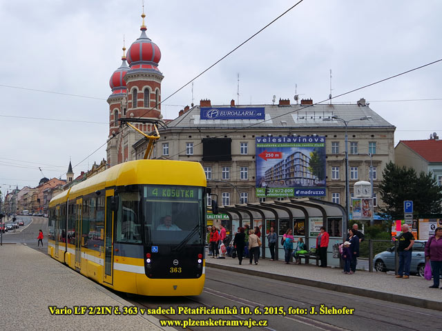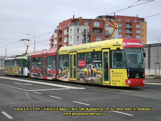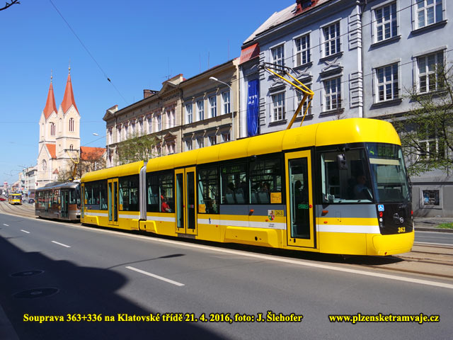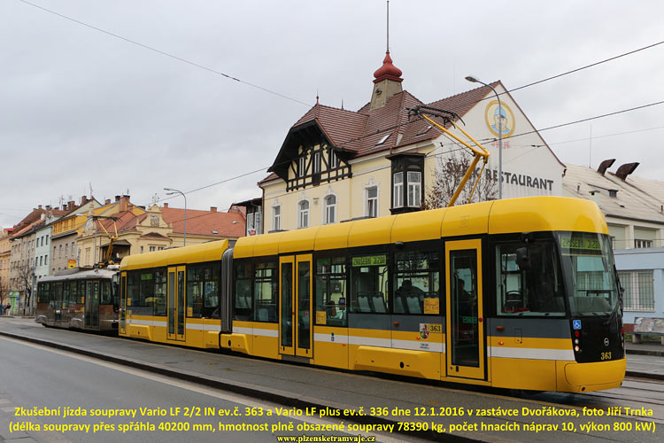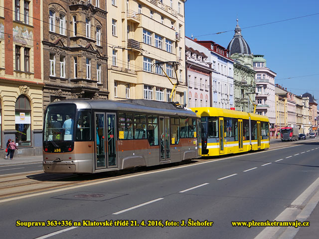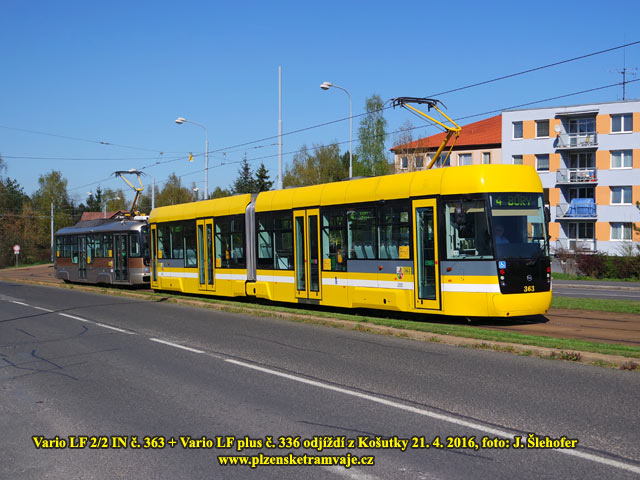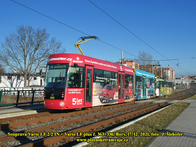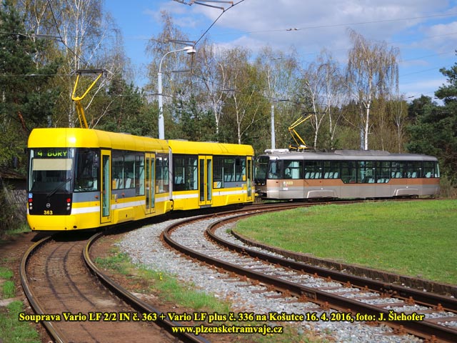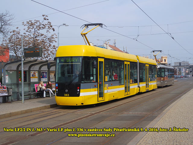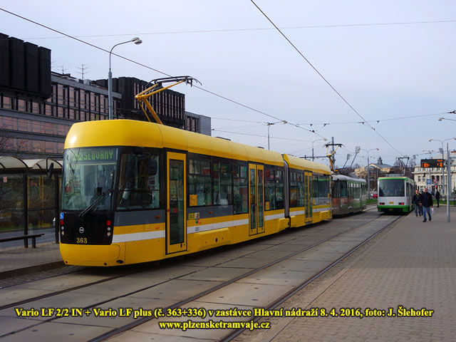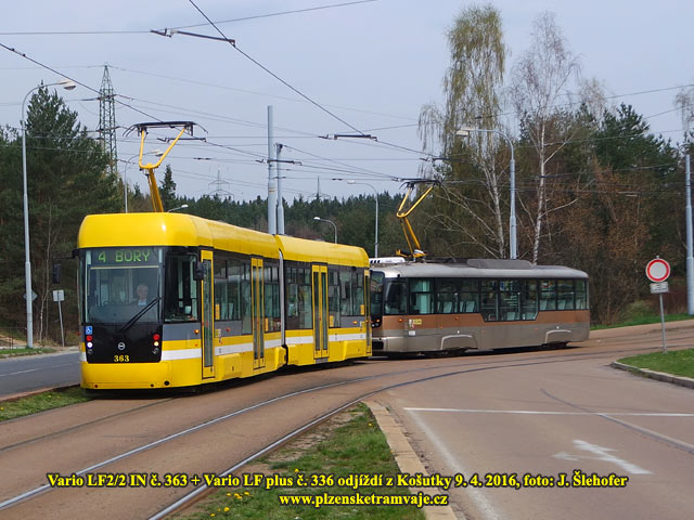 Vario LF 2/2 IN + Vario LF plus (č. 363+336) na Borech 8. 4. 2016 Vario LF 2/2 IN + Vario LF plus (č. 363+336) na Klatovské třídě 8. 4. 2016 V pátek 8. 4. 2016 vyjíždí nesourodá souprava 363+336 konečně do zkušebního provozu s cestujícími a samozřejmě na nejvytíženější linku č. 4. První den je nasazena na šejdrové 23. pořadí, ale následně by tato souprava měla jezdit i na celodenních "tůrách". Kapacita soupravy je cca 2,5 vozů T (tedy o půl vozu více než běžné dvojče), ale na lince č. 4 je v ranní špičce kolem 7:30 i tato souprava plná.