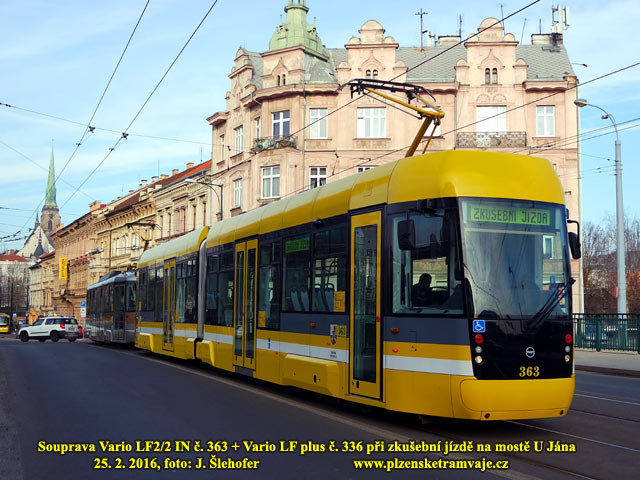 Zkušební jízda soupravy Vario LF 2/2 IN + Vario LF plus (č. 363+336) na Karlovarské třídě 25. 2. 2016 Zkušební jízda soupravy Vario LF 2/2 IN + Vario LF plus (č. 363+336) na mostě U Jána 25. 2. 2016 V únoru 2016 se opět souprava Vario LF 2/2 IN + Vario LF plus (č. 363+336) objevuje několikrát na zkušební jízdě. Před vyjetím na linku je ještě potřeba vychytat poslední mouchy.