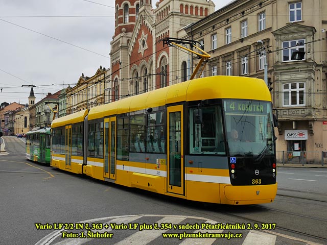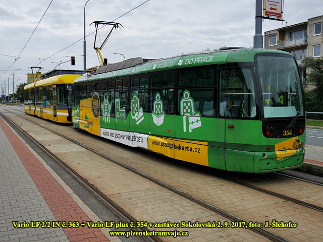 Vario LF 2/2 IN + Vario LF plus (č. 363+354) v zastávce Sokolovská 2. 9. 2017 Koncem srpna 2017 se na zkušebních jízdách opět objevují soupravy Vario LF 2/2 IN ve spojení s vozem Vario LF plus. Došlo totiž k úpravám softwaru výrobcem a soupravy je ještě potřeba vyzkoušet. V sobotu 2. 9. 2017 je souprava 363+254 nasazena na linku č. 4. Důvodem však je testování, na pravidelný provoz těchto souprav to nevypadá.