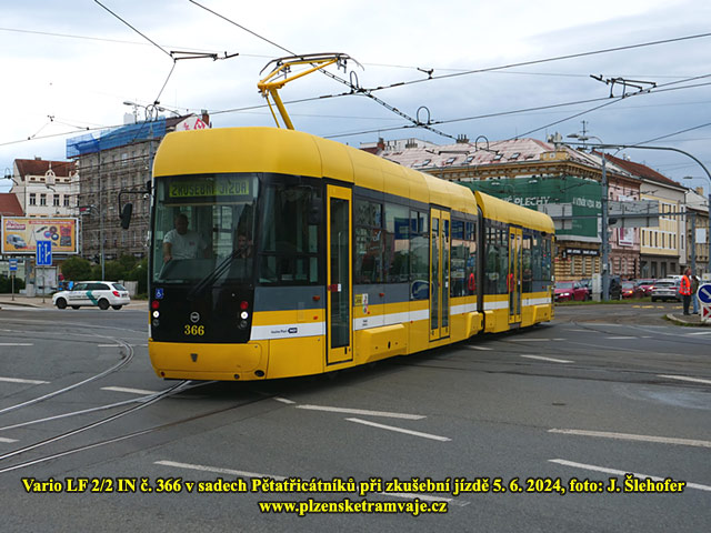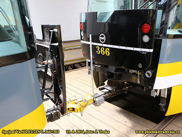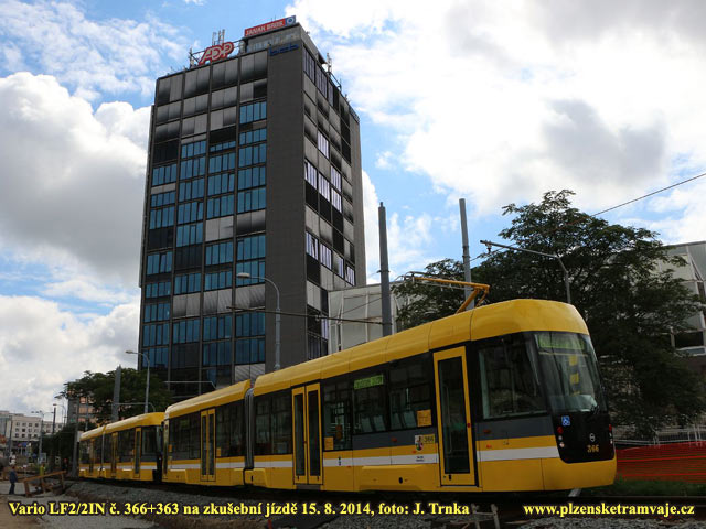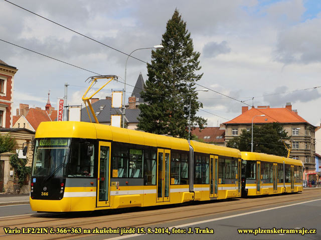Souprava Varií LF2/2 IN č. 366+363 na Klatovské třídě při zkušební jízdě 15. 8. 2014, foto: Jiří Trnka Souprava Varií LF2/2 IN č. 366+363 na provizorní trati U Zvonu při zkušební jízdě 15. 8. 2014, foto: Jiří Trnka V pátek 15. 8. 2014 projížděla městem na Bory souprava Inek č. 366+363. Vozy nebyly elektricky spojené, ale jen první vůz táhnul druhý.