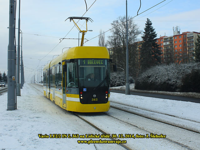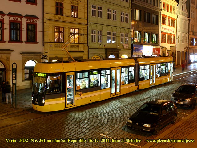 Vario LF2/2 IN č. 361 na náměstí Republiky 16. 12. 2014 Vario LF2/2 IN č. 363 klesá po Lidické do zastávky Bolevecká náves 30. 12. 2014 Od ledna 2015 byl na lince č. 1 upraven jízdní řád pro pravidelné nasazovní vozů o kapacitě 1,5T. Na deset celodenních pořadí jsou tak vypravovány výhradně Astry, nebo Inky. Pouze na čtyři šejdrová pořadí vyjíždějí soupravy 2xT.