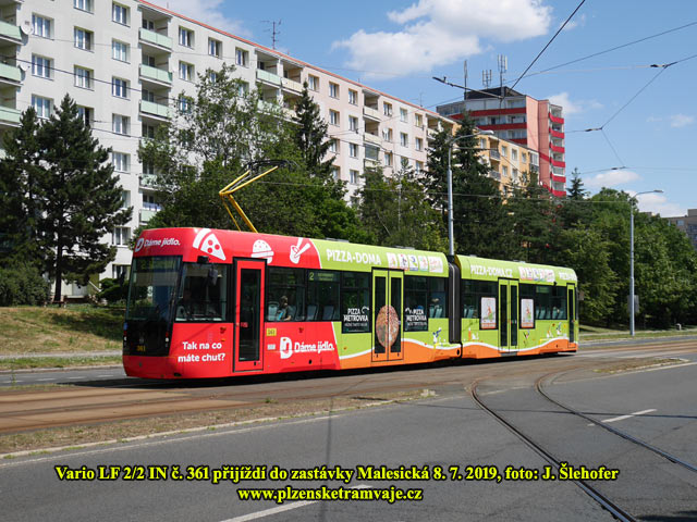 Vario LF 2/2 IN č. 363 přijíždí do zastávky Malesická 8. 7. 2019 Inka č. 361 ve Vejprnické ulici 8. 7. 2019 O prázdninách 2019 jsou Inky spolu s Astrami nasazeny od druhého prázdninového týdne na lince č. 2, zatím co na lince č. 1 jsou pouze sólo vozy. Tato vypravenost měla platit s vyjímkou prvního a posledního prázdninového týdne, kdy se předpokládá přeci jen vyšší počet cestujících. V té době tedy jsou 1x5T vozy na jedničce a na dvojce běžné soupravy 2xT. Nakonec však díky zaplnění některých spojů vyjíždějí čtvrtý prázdninový týden 1,5T vozy opět na jedničku.